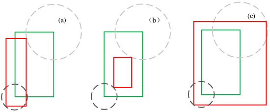 Table 1 demonstrates that when the L2 loss values are the same, the IoU loss values are different, and the GIoU loss values are also very different. It can be clearly seen from the position of the boxes in Figure 9 that the IoU loss values in Figure 9a are significantly less than the IoU loss values in Figure 9c. In Figure 9, the green frames represent the ground-truth boxes, and the red frames represent the prediction boxes. L2. IoU and GIoU are used to calculate the loss.