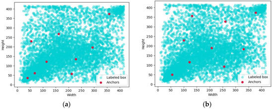 The distance between the sample point calculated in the above process and the clustering center is the Euclidean distance. In object detection, the purpose of clustering is to make the generated anchor box and the annotated ground-truth box closer. The closer they are, the better the clustering. Therefore, the intersection-over-union (IoU) is used to define a new distance, as shown in Equation (3):