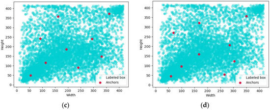 Clustering effect of different algorithms: (a) K-means algorithm with Euclidean distance; (b) K-means++ algorithm with Euclidean distance; (c) K-means algorithm with IoU; (d) K-means++ algorithm with IoU.
