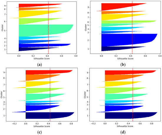 The contour silhouette image of clustering algorithm. (a) K-means algorithm with Euclidean distance; (b) K-means++ algorithm with Euclidean distance; (c) K-means algorithm with IoU; (d) K-means++ algorithm with IoU.