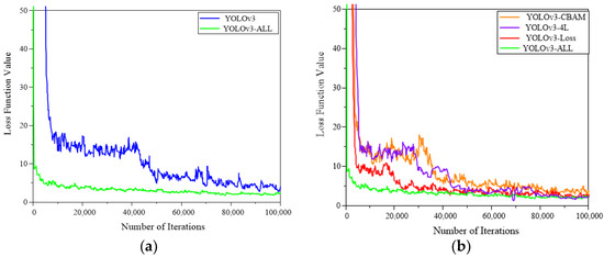 Comparison of four loss function curves. (a) The loss function values of YOLOv3 and YOLOv3-ALL; (b) The loss function values of YOLOv3-ALL, YOLOv3-CBMA, YOLOv3-4L, and YOLOv3-Loss.