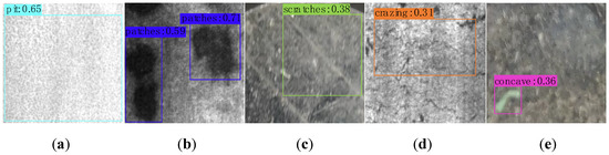 The test results of YOLOv3. (a) The defects of pit. (b) The defects of patch. (c) The defects of scratch. (d) The defects of crack. (e) The defects of pit.