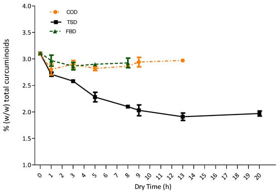 As can be seen in Figure 1, the other drying methods (COD and FBD) preserved the quality of the turmeric rhizomes, i.e., curcuminoids content and antioxidant capacity. For instance, FBD did not affect the content of curcuminoids and the antioxidant capacity of turmeric at the end of the process and presented a shorter drying time when compared to COD. FBD is a technique used in the food industry for various types of products; it has some advantages over TSD and COD: shorter drying periods, color retention, and preservation of bioactive compounds []. Other benefits include greater thermal efficiency, low costs, and easy control []. Therefore, the quality of the turmeric powder is best preserved with this drying method.