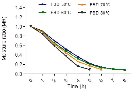 The effect of temperature on FBD in the drying curves of turmeric rhizomes is shown in Figure 3. For all temperatures, we observed that the MR value decreased rapidly after the first hour of drying, as observed in Figure 3, being more evident for the temperature of 80 °C. Sharma et al. evidenced a similar trend for hot air drying and direct solar drying methods []. In our study, the drying time to reach a final moisture content of less than 8% was 8, 8, 6, and 5 h for 50, 60, 70, and 80 °C, respectively. According to these results, with a temperature of 80 °C, the drying time was reduced by 37.5% as compared to drying at 50 °C. Several researchers have previously reported on the dependence of drying time on temperature. This behavior is due to higher temperature increasing the system’s enthalpy, which increases the transfer of mass and energy, accelerating the migration of water []. Chan and Kuo (2018) evaluated different temperatures (80, 100, 120 °C) in a fluidized bed dryer on wheat germ, finding that the efficiency of dehydration was better at a higher set temperature (120 °C). Additionally, shorter drying times might be recommended for a hot and humid environment such as the summer season in Asia [].