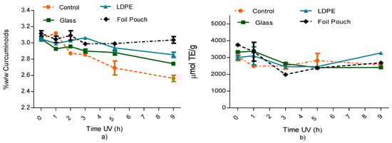 Effect of UV radiation on curcuminoid content using different packaging materials for turmeric powder. (a) Variation of curcuminoid content vs. time. (b) variation of the antioxidant capacity of the powder vs. time.
