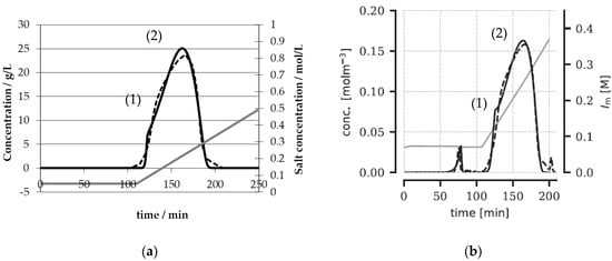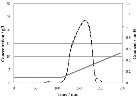 Therefore, it could be proven that the behavior of the Langmuir isotherm, which leads to the shoulder observed in the experimental data (see Figure 1b), can be emulated using the SMA model. When modelling the chromatography with SMA parameters determined via a least square error estimation scheme, the experimentally obtained data can be simulated quite accurately. These SMA simulation results using the test chromatogram from publication [] are compared in Figure 5.