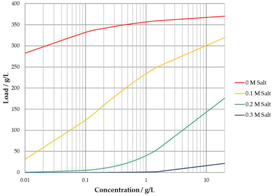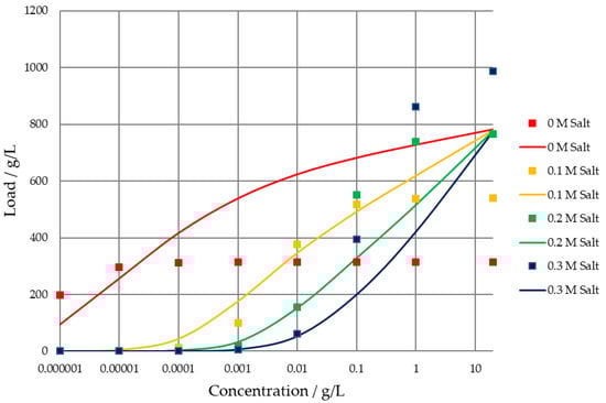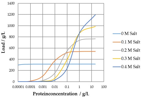 Trying to describe the Langmuir isotherm family using an SMA isotherm approach, it can be seen that the SMA parameters are able to describe the concave–convex change, but do not show the same unrealistic behavior for higher salt concentrations, as the maximum loading capacity is not increased with higher salt concentrations. This effect is depicted in Figure 4. Here, the SMA approach results are summarized as a comparison to the Langmuirian dataset.