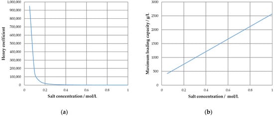 Here, is the maximum loading capacity of the component and is the Langmuir coefficient of the component. and are related by the Henry coefficient ; see (3) []. Salt influence can be described by (4) and (5) defining , , , and as material constants [,].
