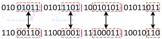 (2) In the crossover operator, couples of individuals are selected to exchange their gene segments to simulate the reproduction process. 4 individuals chosen in the selection operator are randomly combined to form two pairs. For each pair, the crossover process is conducted on multiple points of the chromosome. The crossover point is randomly generated with equal probability. An example of crossover operator is given in Figure 2.