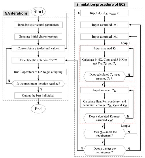To solve the 4-DOF optimization problem, an optimization algorithm modified based on the standard genetic algorithm (GA) is adopted in this work. GA was initially proposed by Professor J. Holland in the 1970s based on Darwin’s theory of biological evolution []. It searches for better solutions by continuously generating offspring with genes to express variables and three operators, including selection, crossover, and mutation, to reproduce individuals. These operators are combined in a particular way, parallel searching based on the chromosome groups, which is distinguished from other algorithms. Therefore, GA is commonly used to generate optimized solutions for complex engineering problems. The present work is based on two aspects of research: GA is introduced to optimize ECS, and a modification of GA itself is also applied to improve the efficiency of energy-saving optimization for energy systems such as ECS.