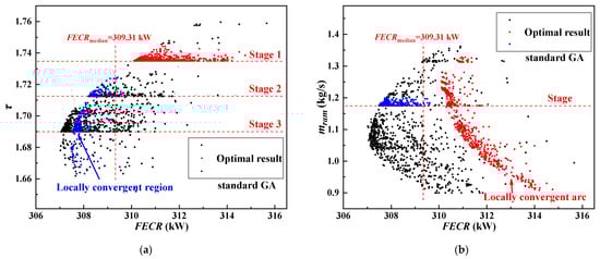 The optimized τ and mram versus FECR from the standard GA are shown in Figure 4a,b. There are three evident locally convergent stages for the temperature ratio at the value of 1.69, 1.7125, and 1.735. The corresponding binary strings are 10000000, 10100000, and 11000000. Similarly, there is also a locally convergent stage for the ram air flow rate occurring at 1.175 kg/s with the binary string of 10000000. As mentioned in the previous part, such binary string is hard to change to an adjacent one through a single mutation step, which is the leading cause of the local convergence. Furthermore, the independent optimization variables influence each other, which is also due to the discontinuity in mutation. As shown in Figure 4a,b, the locally convergent (stage 1) in the temperature ratio of 1.735 maps a locally convergent arc (red points) in the ram air flow rate. Similarly, another locally convergent region (blue points) in the Figure τ-FECR is caused by the locally convergent stage (blue points) in the flow rate of ram air. Therefore, the global convergence property of the standard GA needs to improve.