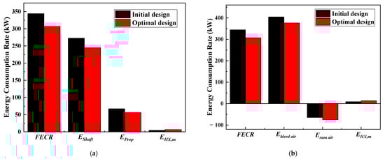(3) The areas of two heat exchangers, the bleed air temperature ratio and the mass flow rate of the ram air are selected as the design variables to be optimized. The pressure ratios of the fan, compressor and turbine in ECS also vary to ensure the outputs meet the demand. After optimization, the FECR decreases from 344.79 kW to 306.97 kW, cutting the energy consumption by 11.0%.