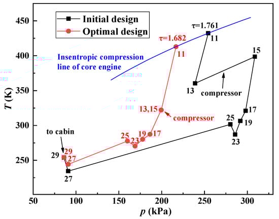 The energy inputs of ECS are contained in the above two inputted airstreams. The ram airstream is pressurized at the cost of propulsive power from aeroengine, while the bleed airstream is directly powered by the engine. The output is the bleed airstream after expanded and cooled at node 30. Thus, the optimization conducted on ECS is to save the energy consumption from the engine when the output keeps constant.