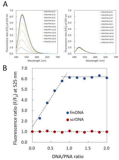 3.1. Hybrid Formation of DNA with PNA Beacon and Fluorescence Detection of DNA by PNA Beacon