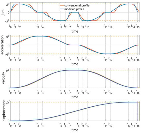 The conventional trajectory model with constant acceleration and velocity phases has similar ramp-up and ramp-down segments in the jerk motion profile (red line in Figure 1), which may reduce the motion efficiency in the case of a high ramp coefficient []. Thus, to overcome this deficiency, we propose the locally asymmetrical jerk motion profile with low ramp-up, as shown (blue line in Figure 1). We define the terms similarly in [] to describe the trajectory segments. Df denotes the displacement at the end of the sustained pulse of the velocity. Vp, Ap and Jp represent the peak values of the velocity, acceleration and jerk during the motion, respectively. ti represents the time at the end of the ith segment, where i ∈ {0, 1, …, 15}.