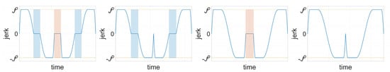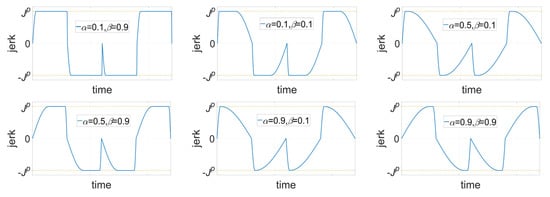 Nonzero jerk can occur at the initial and goal positions during the motion when α or β is set to 0 (i.e., T1 = 0), which will increase the wear of the robot structure and should be avoided to enhance the reliability of IRs. Thus, α > 0 and β > 0, i.e., T1 > 0. In addition, to generate a jerk-continuous trajectory, β ≠ 1 (i.e., T3 ≠ 0). Note that the local jerk profile is symmetrical when β = 0.5 (i.e., T1 = T3). Therefore, the domain of α is set to (0, 1] and β to (0, 1), to ensure that the jerk of the generated trajectory is continuous and its values are zero at the initial and goal positions. The jerk motion profiles with different α and β are shown in Figure 2.