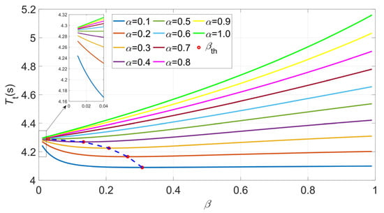 Thus, Df and Jp can be considered as the proportionality coefficients of Tt, and the variation trend of Tt is only determined by α and β. For example, when Df = 140 deg and Jp = 70 rad/s3, the impact of different α and β on Tt is depicted in Figure 3.