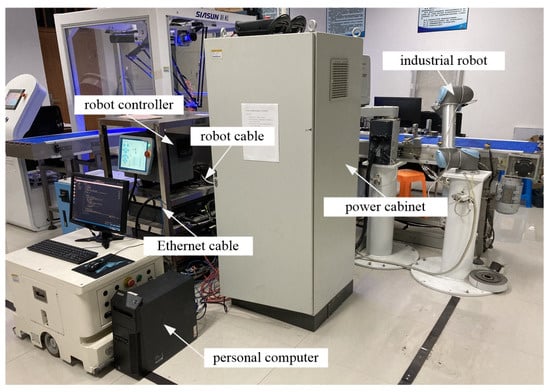 To demonstrate the feasibility of the proposed algorithm, the numerical simulation and experiments tested on a real industrial robot were carried out. We ran the numerical simulations using the MATLAB R2018b on a Windows 10 personal computer with a Core i5-1035G1 CPU and 16 GB of RAM. An experimental platform was built up to mimic a pick and place operation, and validate the numerical simulations. This platform mainly included a six-axis industrial robot Universal Robots UR5, a robot controller CB3 and a personal computer with Linux operating system, as shown in Figure 5. The robot controller was controlled over TCP/IP protocol by a script implemented in Python using the Real-Time Data Exchange (RTDE) interface ur-rtde 1.4.3. The script fed the joint position targets to the robot controller to simulate a pick and place operation. This script was implemented on a personal computer with a Core-i3 4130 processor and 4 GB of RAM.
