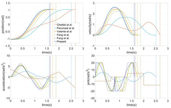 The motion profiles of joint 4 which determined the execution time, generated by the benchmark methods and this work, are shown in Figure 6. The cubic polynomial trajectory model failed to produce jerk-continuous motion, and the values of the acceleration and jerk were both non-zero at the initial and goal positions, which can lead to the vibration and the wear of the joint. The motion profiles generated by [,] show that the jerk limits failed to be reached, which resulted in the longer execution time compared with other algorithms. In contrast, the jerk limit was utilized from Refs. [,,], which resulted in higher efficiency trajectories compared with Refs. [,]. The proposed algorithm yielded the best velocity in the shortest time, but it failed to obtain better acceleration than the benchmark methods.
