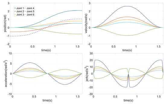 When α = 0.5 and β = 0.1, the motion profiles of the joint position, velocity, acceleration and jerk generated by the proposed algorithm for the test task are illustrated in Figure 7. The optimized trajectories were smooth, and the motion curves under the kinematic constraints were all bounded and continuous all the time. The values of velocity, acceleration and jerk were zero at the initial and goal positions. In addition, all the joints started and stopped at the designated positions synchronously.