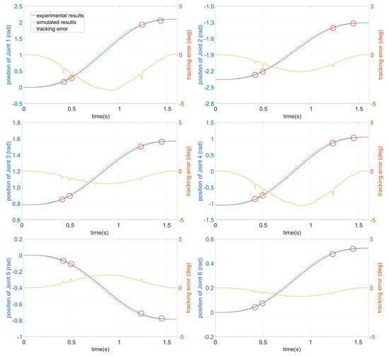 Twenty trials were carried out to compare the results of the experiments and simulations for reducing the random errors, and to obtain the measurement uncertainty expressed in terms of the variance. The results of a trial with the corresponding tracking errors in the joint space are depicted in Figure 8. The experimental curves were consistent with the simulated ones in general, except for some tiny deviations resulting from the parameters configured in PID. Additionally, several abnormal data, circled in Figure 8, appeared randomly, which may have been caused by the interference in the data transmission from the sensors to PC. Ignoring these abnormal data, the mean values of maximum absolute tracking errors and terminal errors with their variances of all joints for twenty trials are listed in Table 5. The results showed that the maximum absolute tracking error of a joint was proportional to the assigned displacement of the joint. Moreover, the absolute terminal errors at the goal positions were all within 0.04° and their variances were close to zero. Therefore, the experiments on a real industrial robot verify the effectiveness of PTPA.