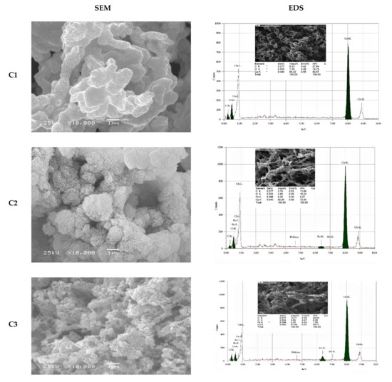 Scanning electron microscopy (SEM) images and energy dispersive spectrometry (EDS) patterns of the C1, C2, C3, and C4 samples.