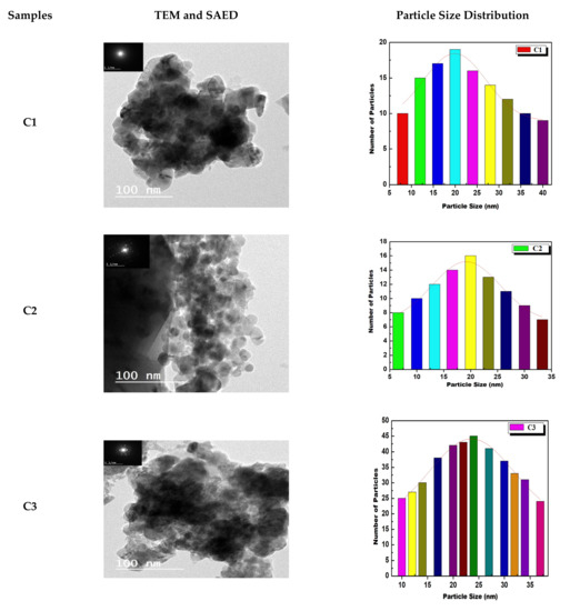 The transmission electron microscopy (TEM) technique enabled us to study some specified morphological properties, such as the morphology, crystallization, particles sizes, and size distribution of the investigated samples. Figure 7 (left of Figure 7) displays TEM images of the C1, C2, C3, and C4 samples. This figure shows the presence of some agglomerated particles in different samples. The C1 and C2 samples contain many spherical and monoclinic-like structures with moderate sizes. The particles of the C3 and C4 samples have many spherical-like structures with high sizes due to the high agglomeration of nanosized particles. Figure 7 (right of Figure 7) also depicts the histogram for the particle size distribution of the C1, C2, C3, and C4 samples with an average size of the order of 20, 20, 24, and 55 nm, respectively. This indicates that Fe-doping stimulates the agglomeration of nanosized particles, yielding an increase in the grain size of the as-prepared solids. This behavior is comparable to that obtained from the XRD measurements. Figure 7 (inset on the left of Figure 7) shows a set of concentric rings for the C1, C2, C3, and C4 samples, indicating the polycrystalline structure. These rings connected with well-defined spots, which emphasized the formation of highly crystalline particles.