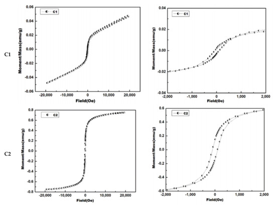 Unsaturation of the M-H curve was observed for the C1 sample in the presence of superparamagnetic-like behavior. Saturation of the M-H curve was observed for the C2, C3, and C4 samples with contributions from ferromagnetic and superparamagnetic components.