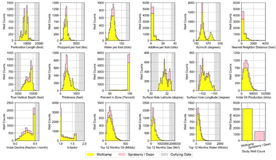 The distributions of the static study features of interest are evaluated to screen and remove potential outlying well data and refine the overall dataset. Their distributions are presented in Figure 3. Data outside of +/− 3 standard deviations from a given feature’s mean value (grey margins within subplots in Figure 3) are considered outlying and possibly highly influential on ML model response [,]; even if distributions are not explicitly gaussian. All outlying data is removed from the static and dynamic contributions to the dataset (approximately 270 wells had features meeting outlying criteria). The resulting dataset consists of 6210 wells in total extending across 12 Texas counties, the extent of which is plotted in Figure 2 and the descriptive statistics for features from these wells are summarized in Table 2.
