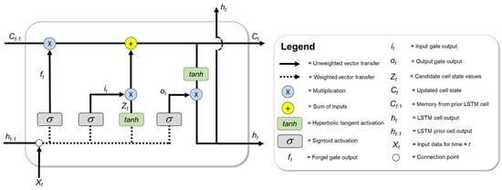 The LSTM concept was first introduced by Hochreiter and Schmidhuber in 1997 [] and subsequently expanded and adapted by other since. LSTMs utilize a memory cell structure (Figure 5) to handle both shorter and long-term dependencies in time series datasets []. Short-term memory is captured as input from previous timestep cell output (ht−1). The long-term memory component is reflected in the cell state (Ct−1). LSTM memory cells have the ability to add or omit information to the cell state (i.e., Ct−1 → Ct), but only does so through carefully regulated structures called gates. Network gates consist of either sigmoid or hyperbolic tangent (tanh) activation coupled with pointwise multiplication operations.