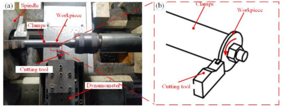As illustrated in Figure 2a, the orthogonal micro-turning experimental was conducted on a CKD6150H CNC lathe-machining center. The schematic diagram of orthogonal cutting is shown in Figure 2b. Because the feed rate in the micro-cutting process is very small, when the feed rate is less than the minimum chip thickness, the workpiece material does not produce chips, resulting in a severe ploughing and rubbing phenomenon on the surface of the workpiece [15]; when the feed rate is greater than the minimum cutting thickness, the workpiece material will only produce chips. Based on the previous studies’ results [21,22,23,24], a PVD-coated carbide insert (TiAlN) with an edge radius of 25 μm was chosen as a cutting tool in this study, which met the experimental criteria. The rake angle of the cutting tool was 10°, and the relief angle was 11°. The nose radius of the tool was 0.19 mm. The workpiece was disc-shaped with a diameter of 40 mm and a thickness of 1 mm, with a hole in the center. The workpiece was clamped by the fixture and then cut with spindle rotation. The cutting force was measured by Kistler 9257B Dynamometer three-component piezoelectric dynamometers during the experiment, and the lubrication conditions for cutting were dry conditions.