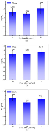 The roughness of machined surface at different feed rates. (a) Grain size = 30 μm, (b) Grain size = 40 μm, (c) Grain size = 60 μm.