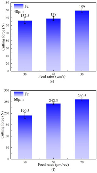 The cutting forces at different feeding rates. (a–c) Cutting forces Fp of Grain size = 30 μm, 40 μm, 60 μm, respectively; (d–f) Cutting forces Fc of Grain size = 30 μm, 40 μm, 60 μm, respectively.