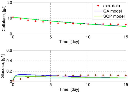 Comparison of the experimental data and model predictions for substrates cellulose and glucose obtained by GA and SQP models—identification results.