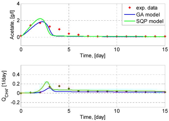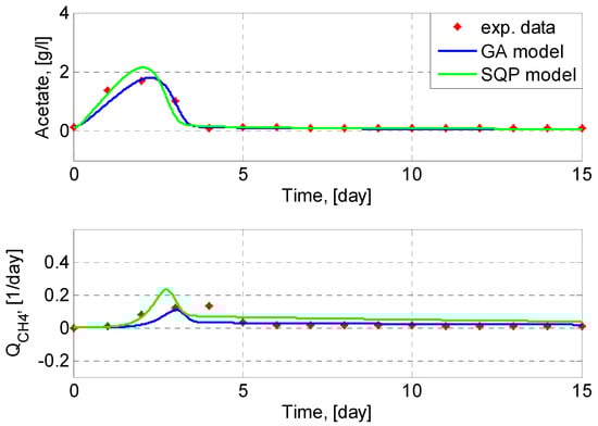 Comparison of the experimental data and model predictions for acetate and methane obtained by GA and SQP models—identification results.