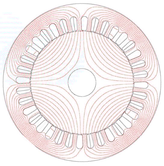 Existing parametric algorithms can designate a range of design variables and efficiently search for an optimal shape within them. However, the parametric algorithm has limited changes in shape and has disadvantages, in that it cannot search for complex shapes compared to the initial model. Figure 1 shows the magnetic flux flow when there is only a steel core without blocks, such as a magnet or air in the rotor. To increase the salient pole ratio, it is necessary to suppress the magnetic flux flow in the other axis, without disturbing the magnetic flux flow [15,16,17,18]. Therefore, air barriers, similar to magnetic flux lines, are inserted, as shown in Figure 2. In contrast to an IPMSM, because a SynRM does not have a magnet inside the rotor, the straight-line structure is not forced, but, rather, a curved air barrier can maximize the d–q axis reluctance difference. Topology optimization (TO) is a technique suitable for finding shapes that include curves with multiple curvatures, such as the SynRM design. Because the TO directly deforms the shape and searches for the optimal shape, it is possible to search for a shape beneficial to the magnetic flux flow that the user has not predicted [19,20,21,22]. In addition, in the TO, the number of models to be explored increases exponentially, according to the material of the design target. Because the SynRM rotor has only two materials, iron and air, it is appropriate for TO. Therefore, there are many papers applying TO to SynRM [23,24,25,26].