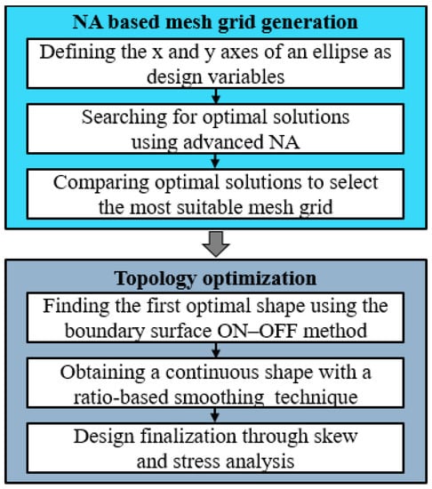 Despite the optimization of SynRM, which consists of two materials, many analyses are required to determine the optimal design with high performance. For efficient searching, the mesh grid and initial shape should be specified. A parametric algorithm, the niching algorithm (NA), was used to select the initial shape, while setting the major and minor axes of the ellipses constituting the mesh grid. Afterwards, the ON–OFF method was applied to the optimized mesh grid and the initial model. The ON–OFF method can find the optimal shape by repeatedly making models in which the cells constituting the mesh are changed one by one, determining the material by comparing the values of each objective function, and obtaining the next shape. To minimize the number of analyses required for the ON–OFF method, the ON–OFF method sequence was performed on the material boundary surface of the model only.
