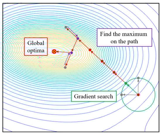 The gradient descent method is applied to a given model to search for an optimal point. This method finds the direction in which the slope of the objective function is steepest. If the optimum point is passed after moving, the moving interval is reduced and the search is repeated in the same way. If the movement interval is specified by the user, the maximum gradient method is terminated. The green circle in Figure 7 shows the process of finding the maximum slope. If the search point enters the niche range during the gradient descent method, it goes through the niche judgment process, and if it is regarded as a duplicate search, the process moves to Step 5.