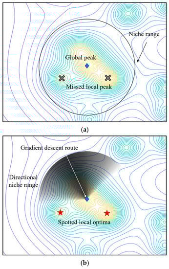 The existing niching algorithm sometimes misses the local optimum, due to the niche range, as shown in Figure 8a. The omission of local optimal points can be dramatically reduced through the directional niche region.