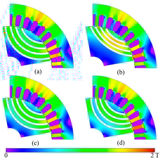 Shape and magnetic flux density of the SynRM models with directional auto-tuning NA applied. (a) model a, (b) model b, (c) model c, (d) model d.