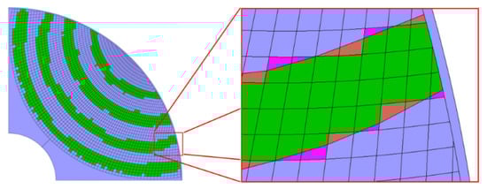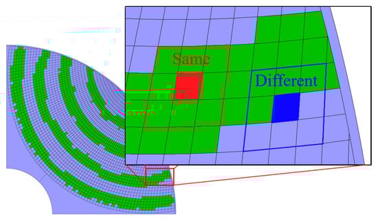 The ON–OFF method uses a mesh grid that divides the designed target area into small pieces, to determine which material will be assigned to each cell. An example of a mesh grid is shown in Figure 10. The material of the cell is designated by comparing the objective function value of the existing model and model in which one cell has been changed. Therefore, the number of analyses is the number of cells, and if the number of materials increases, the number of required analyses increases exponentially. The number of analyses required to proceed with one step of the ON–OFF method can be expressed as , where is the number of cells and is the number of types of material. In the case of SynRM, it is advantageous to apply the ON–OFF method because there are only two materials, air and iron. The ON–OFF method consists of the following processes: