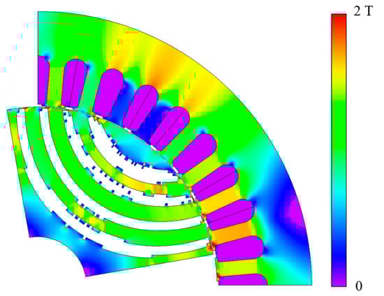 The ON–OFF method changed the layers and identified a model with an average torque of 90.02 Nm and a torque ripple of 28.11%. The model obtained through the ON–OFF method is shown in Figure 11. The average torque increased; however, the torque ripple also increased. Therefore, additional techniques are needed to reduce torque ripple.