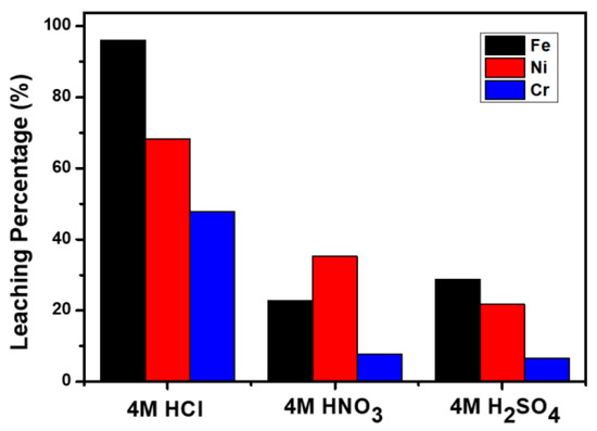After removing oil and water content, the remaining solids were ground and then sieved with a 100-mesh screen to increase contacting area and leaching efficiency. The metal concentrations of sludge after pre-treatment are shown in Table 2. The sludge calcined at 900 °C for 8 h was leached by 4 mol/L HCl, , and with liquid-solid mass ratio of 100 mL/g, 24 h, and 25 °C. The result in Figure 3 indicates that HCl had the highest leaching efficiency for iron, nickel, and chromium. Due to the existence of , it caused pitting corrosion to enhance the ability of acid leaching while the effects of and were not significant [36]. Therefore, 4 mol/L HCl was chosen for the leaching process.