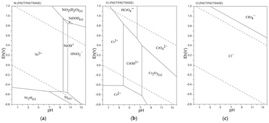 The Eh-pH diagrams of (a) nickel, (b) chromium, and (c) chlorine.