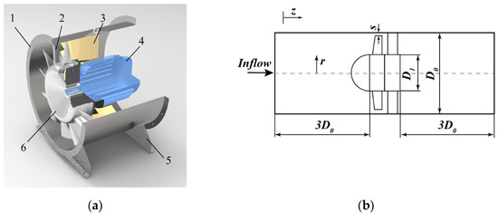 We employ an industrial low-pressure axial fan with a rear guide blade structure as the prototype for multi-objective optimization problems in this study. As shown in Figure 1a, the fan is composed of an impeller, rear guide vane, machine shell, and other flow-passing parts. The axial fan located in the pipeline is shown in Figure 1b and is part of the air conveying system’s air supply component. An extension section is located at the inlet and outlet of the fan system to reproduce the actual flow, and the motor embedded in the fan center exerts specific flow resistance on the fan. The flow field is simplified to facilitate analysis by removing complex structures in the following simulation. Table 1 summarizes the key design parameters of the original axial fan.