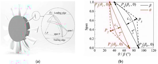 A new blade design method is adopted in this study. The mean camber line is a circular curve. The blade pattern is generated by a NACA 65-010 airfoil developed by the National Advisory Committee for Aeronautics (NACA) [10]. Here, we define the angle between the chord and leading-edge as the blade angle β and define the central angle of the mean camber line as the blade bending angle θ. The angle position is shown in Figure 2a, where “span 0” represents the base of the blade and “span 1” represents the top position of the blade. The distribution of blade angle β along the span determines the blade twist law, and the distribution of blade bending angle θ along the span determines the blade bending law.