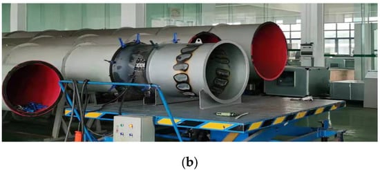 The aerodynamic performance of the original axial fan is investigated in a ducted test device, following the performance testing standard of the International Organization for Standardization (ISO) 5801:2017 Industrial fans—performance testing using standardized airways [17]. Figure 5 shows the structure diagram of the fan test system and a photograph of the fan test site.
