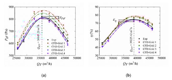The deviation in maximum total pressure (εPtF) and maximum efficiency (εη) and are 3.02% and 2.28%, respectively. Based on the authors’ knowledge, the deviation is mainly caused by two factors. The first is the simplifition of geometry, as the motor structure is simplified to generate a series of high-quality full-structured meshes. The second is due to inevitable errors in both the numerical simulation and the experimental test. The deviation between the calculated and experimental data is lower than 5%, which is acceptable according to previous studies [18,19,20,21]. The total grid quantity selected eventually reaches approximately 11.02 × 106.