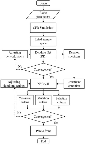 We adopt the Latin hypercube design method (LHD) [23] to generate a sample space of six variables. The impeller design platform is built based on MATLAB, and the impeller model and computing grid are generated in batches. The total pressure coefficient (ψOPT) and efficiency (ηOPT) of the fan are then predicted by CFD numerical simulation, and the original sample database is established. Enormous computing resources are needed to complete the numerical calculation of all samples in genetic algorithm optimization. Dendrite Net (DD) [24] is introduced to improve optimization efficiency to establish a variable mapping between the impeller and performance parameters. The predicted fan performance parameters are obtained by training the DD network. Finally, DD is coupled with the non-dominated sorting genetic algorithm-II (NSGA-II) [25]. The optimization process was finished once the prediction results reach the termination conditions of the genetic algorithm. The optimization process is shown in Figure 7.