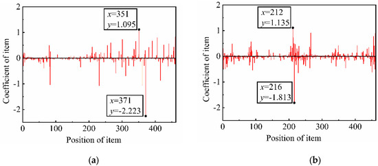 It is well known that the relationship between the inputs and outputs of the system can be expressed by the accumulation of the trigonometric function or polynomial. This study uses DD as a tool to transform the complex system into a polynomial. The relation spectrum shown in Figure 10 expresses the impact of the blade angle parameters on ψOPT and ηOPT, and the impact contains independent and interaction effects in different orders. The relation spectrum can be read by way of a checklist. “Position of items” corresponds to “Items” in Table 4. The relationship between blade angle parameters and ψOPT /ηOPT can be expressed as: